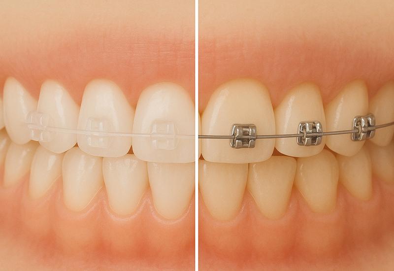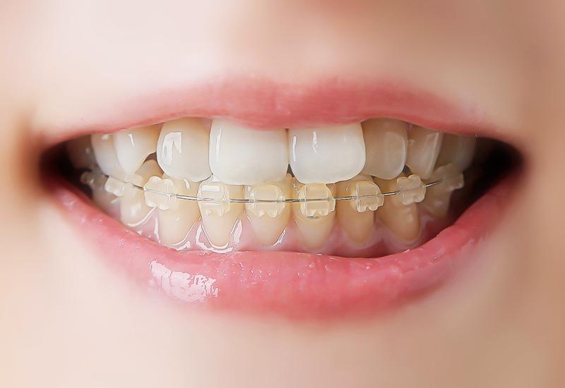 歯の表面に透明な装置がつきますが、金属ワイヤーより目立ちにくいです。